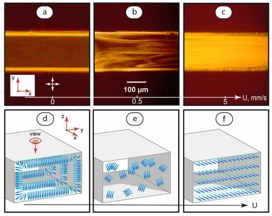 Further increasing of the flow velocity in the range of 1 to 5 mm/s initiated a transition of the LC system to a bright-field flow (Figure 2c) of LC domains oriented along the flow axis. Such a flow represents a planar alignment of the LC molecules (Figure 2f).
