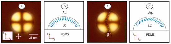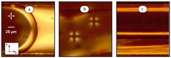 Smaller LC droplets (Figure 4b) showed a considerably different orientation pattern in polarized light (Figure 4b). They exhibited a “Maltese Cross” texture [44], which rotated with the respective rotation of polarizers. In our experiments, such a texture was demonstrated by mobile droplets with diameters less than the microchannel width and also by droplets immobilized at the bottom of the microchannel. Such a texture indicated that the mesophase molecules are oriented perpendicular to the LC-water boundary.