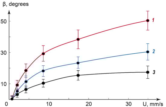 The impact of the flow velocity on the deformation angle β. Approximate droplet diameters: 60 μm (1), 30 μm (2), and 20 μm (3).