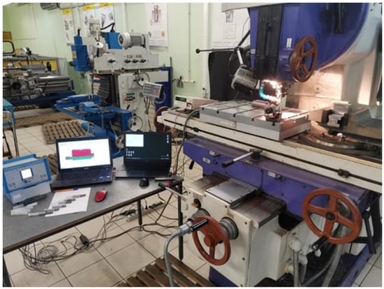 Experimental research during milling was carried out on certified equipment to ensure the reliability of the obtained test results, specifically on vertical milling machines of normal accuracy and rigidity “VM 127M” (Votkinskiy Machine Building Plant, Votkinsk, Russia) and “Knuth WF 4.1” (KNUTH, Wasbek, Germany) (Figure 1). Figure 1 of vertical milling machine “VM 127M” shows the complexity of the equipment for measuring and recording the components of forces and cutting temperature, from left to right: dynamometer amplifier; PC with software “KISTLER” (version 2825A-03-2); PC for recording cutting temperature with TEMS converter for the temperature; millivoltmeter on the machine table; and three-component dynamometer “KISTLER” with a workpiece mounted on it.