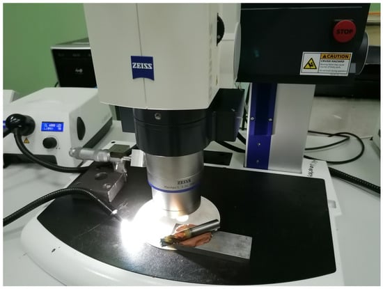 The study of the machinability of titanium alloys in full-scale tests was carried out as applied to the conditions of semifinishing and finishing machining: at n = 2000 rpm; S = 200 mm/min; ae = 5 mm; and ap = 1.5 mm. In this case, as shown by preliminary experiments and analysis of literature data [,,,,], in the conditions of finishing and semifinishing cutting, the determining element of tool wear is the wear chamfer on the rear surface of the cutting wedge. Analysis of the rear surface wear profile showed that the average wear of the rear surface along the main cutting edge is characterized by the smallest variability of the wear measurement results. This parameter at constant values of the front and rear angles of the cutting wedge reflects the dimensional wear resistance of the whole tool. Based on the above, the average width of the rear surface wear chamfer (excluding notches) was used as the investigated tool wear parameter. In the process of milling to ensure the identity of the results and to exclude errors of measurement, the width hr of tool wear chamfer on the back surface was measured using the reading microscope MIR-2M with nozzle MOB-I5 accurate to 0.002 mm at the workplace, and when it reached hr = 0.3–0.4 mm, for additional control and photofixation of the wear pattern, a universal motorized stereo microscope with the possibility of telecommunication “Carl Zeiss Stereo Discovery V12” (ZEISS Microscopy, Oberkochen, Germany) with a visualization system based on the video camera “Zeiss Axiocam 503 Color” (ZEISS Microscopy, Oberkochen, Germany) was used (Figure 2). In this case, the wear of the cutter was measured at certain number of passes, and the cutting path length was set to obtain a picture of all stages of the wear curve (section of the running-in, normal, and catastrophic wear).