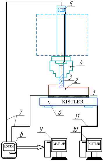 Schematic diagram of measuring temperature and cutting force components by natural thermocouple method. 1—insulation; 2—workpiece; 3—insulated cutter; 4—chuck; 5—mercury current collector; 6—dynamometer “Kistler”; 7—connecting wire; 8—amplifier–converter; 9—computer for registration of thermal emfs; 10—computer for registration of cutting force components; and 11—connecting bus.