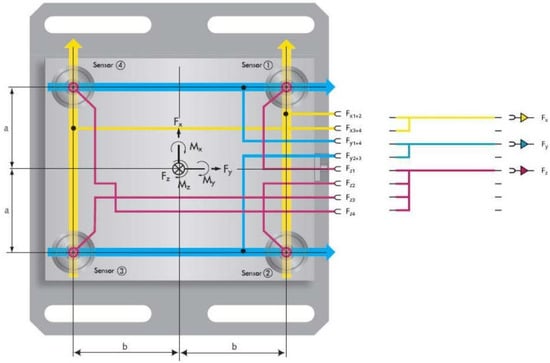The resulting force acting on the dynamometer is proportional to the algebraic sum of the corresponding components of the individual forces, which are formed because of the parallel arrangement, as shown in Figure 6. Thus, the dynamometer is a multicomponent force sensor, independent of the point of its application.