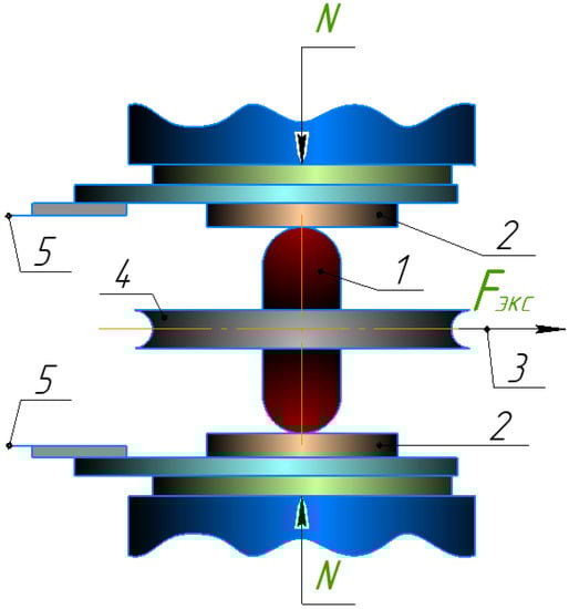 Model of frictional contact. 1—Spherocylindrical indenters of the tool material, 2—cylindrical samples of the same machined material, 3—traction cable, 4—disk with a slot for cable 3 and for mounting 1, and 5—electrical wiring.