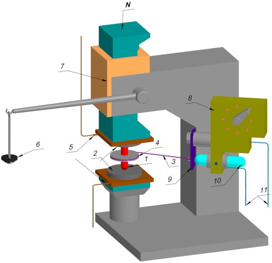 It is known that adhesion wear is most prevalent in machining, and at the same time, to reduce the time to determine the effective coating composition and application modes, as well as reduce the cost of both the tool and cathode material, several adhesion tests were carried out. To estimate the tribotechnical parameters (τnn, prn, and τnn/prn), an experimental method [] was used. This method is based on the physical model (Figure 8) and the developed setup (Figure 9) [,], which in the first approximation reflects real friction and wear conditions at local contact. According to this model, a spherical indentor (1) made of tool material H10F with different coatings (simulating a single rough spot of rubbing solids), squeezed by two plane-parallel samples (2) made of titanium alloys Ti64 and Ti811 (with high accuracy and cleanness of contact surfaces), rotates under the load N around its own axis. The force Fex expended on the indentor rotation and applied to the tether (3) placed in the disk slot (4) is mainly related to the shear strength τnn of the adhesion bonds. The other end of the cable is connected to the elastic elements (9, 10) and the recording device by means of the wire (11) on which the drive forces for the rotation of the indentor (1) are recorded. Ensuring the temperature regime in the contact zone of the indentor with the samples of the processed material in a wide range of variation (0–1300 °C) uses the electrical contact method, and a high voltage is supplied from the power-controlled transformer to the terminals (5) isolated from the housing.