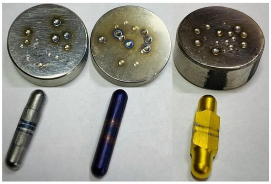 Samples of machined (flat cylindrical heels) and tool materials (finger cylinders with spherical tips on both sides) with different wear-resistant coatings applied.