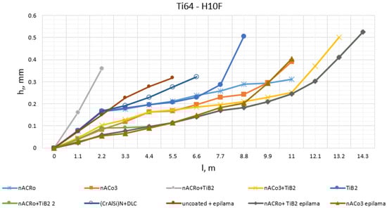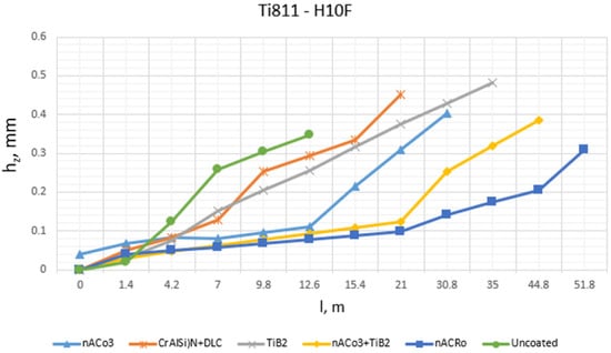Effect of the cutting path length (l, m) on the value of wear on the rear surface (hr, mm) during milling of titanium alloy Ti64 by carbide cutters of grade H10F with different coatings (n = 2000 rpm, Smin = 200 mm/min, ae = 5 mm, ap = 1.5 mm).