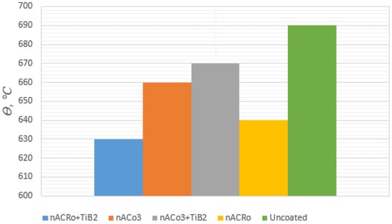 It is known that the temperature and cutting forces can have a two-fold influence on the intensity of cutting tool wear: on the one hand, increasing temperature reduces the direct effect of the force factor, and on the other hand, increasing temperature leads to the formation of secondary structures and phases on frictional contact with a corresponding change in physical and mechanical properties. Consequently, when creating tool materials and wear-resistant coatings with a friction adaptation effect, it is necessary to consider the specified region of cutting modes and the cutting temperature interval corresponding to this region [,,,,,].