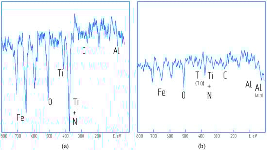 Intensive tribo-oxidation of the cutting tool surface occurs during high-speed machining. Figure 24 shows Auger electron spectra for tools with nACRo wear-resistant coating. The oxidation of the contact surfaces is obvious, as evidenced by the presence of large amounts of oxygen in both spectra. The intense ionic peaks correspond to the adhesion zones of the part material. The Ti line is significantly stretched (Figure 24b) in this zone; this is the result of the oxidation process. An increased amount of aluminum oxide is observed in the spectrum of the filtered coatings, which is shown as a shift in the aluminum line to a lower energy zone (60 eV). At the same time, the intensity of the metallic Al LMM line level around 68 eV decreases.
