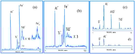 Spectra of positive (a,b) and negative (c,d) secondary ions of the surface of worn nACRo-coated plates: (a,d)—after 3 min of cutting; (b,c)—after 20 min of cutting.