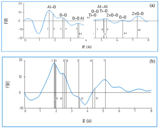 The atomic structure of the films appearing on the wear zone surface during tribo-oxidation of the nACRo coating was compared with the oxide layer obtained during oxidation of the binary TiAl alloy under equilibrium conditions. Figure 26 shows the Fourier transforms because of mathematical consideration of the fine structure of electron spectra close to the line of elastically scattering electrons. The positions of the peaks on the Fourier transforms correspond to the interatomic distances for the closest coordination spheres. The decoding of the data was based on the analysis of known crystal characteristics of oxides formed on the surface. The positions of the main peaks of the Fourier transforms correspond to the interatomic distances associated with the Al2O3 and TiO2 lattices (Figure 25) [,,,].