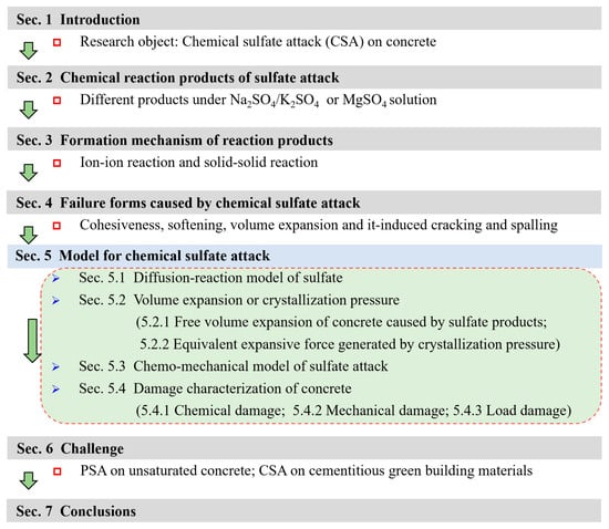 In this paper, the behavior (sulfate transport-chemo-mechanical behavior) of CSA on concrete is the main discussion object. The degradation of concrete structures caused by CSA is the result of long-term corrosion, and the model prediction is a necessary analysis method for the CSA-induced durability problem. To clearly describe the current research status of the CSA model, the reaction products of CSA, their formation mechanism, and them-induced failure forms of concrete are first described simply. Most of these studies were completed between the 1980s and 1990s, and a few were developed after the 2000s. Then, the numerical model for CSA behaviors is presented module by module. It involves the diffusion of sulfate ions, chemical reactions, the it-induced volume expansion of concrete, crystallization pressure in the pore solution, and mechanical responses (expansive stress, strain, damage degree) in the concrete, and most of these works were carried out after 2000. The framework of this paper is shown in Figure 1.