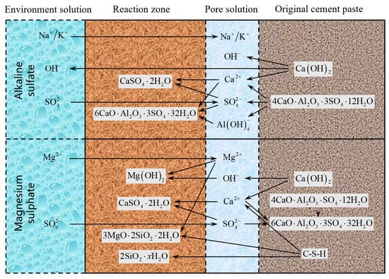 Chemical reactions in concrete under different cation sulfates [30].