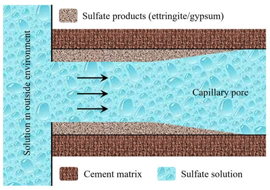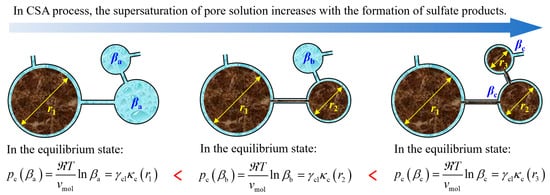 Furthermore, Scherer [44,45], Steiger [52,53], and Müllauer [57] also pointed out that the crystallization pressure in a single pore, exceeding the materials’ tensile strength, cannot cause the destruction of porous materials such as cement mortar and concrete. However, the equivalent expansion stress in the local area of porous materials caused by crystallization pressure in multiple pores will result in the macroscopic expansion and cracking of a porous material. In the process of CSA, there are several connected pores with different space sizes in the local area of concrete, while their solution supersaturations are the same. According to the crystallization pressure theory, the crystals in these pores with the same supersaturation pore solution have the same curvatures/sizes in the equilibrium state, and a smaller crystal (with a large curvature) needs higher supersaturation to maintain its size [57]. If there are two crystals with different sizes in the same pore solution, the small crystal dissolves first, and the solute molecules transfer to the large crystal, resulting in an increase in its size [58]. Thus, with the increase in pore solution saturation, ettringite first crystallizes in big pores. After the big pore is filled to a certain extent, the crystals continue to fill into small pores; that is, small pores are filled after big ones [57], as shown in Figure 3. Meanwhile, the crystallization pressure increases to cause macroscopic damage to concrete.