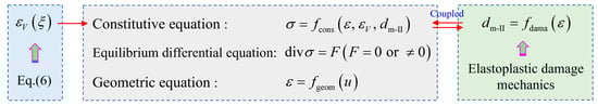 Therefore, the quantitative method of load damage based on the elastoplastic damage mechanics is used to characterize the stress-induced mechanical damage of concrete under CSA, such as Bary et al. [84,87], Yin et al. [96,102], in which the basic expression of damage is similar to that in Mazars’ damage model [109]. The specific equations of mechanical damage are also presented in Table 7. As shown in the table, the difference in the calculation method of I type dm (dm-I) and II type dm (dm-II) is whether the calculation can be decoupled. dm-I can be directly calculated by the free volume expansion from the growth of sulfate products, namely . dm-II needs to be numerically solved by coupling with stress and strain, and they all need to meet the unified equations, including the equilibrium differential equation, constitutive equation, and geometric equation, as shown in Figure 5.