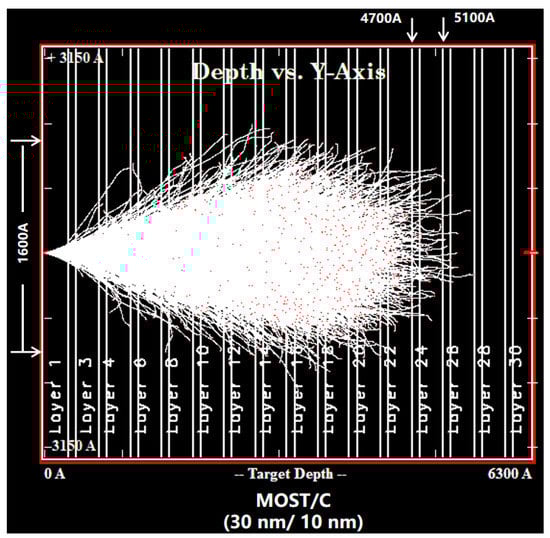 SRIM software was used to simulate the bombardment process of heavy ions for MOST/C nano-multilayer films before the irradiation experiment, as shown in Figure 1 []. In the simulation process, the Au2+ ion beam focused on a point on the surface of the film and injected into the film. To show the irradiated area more clearly, only a film with 15 cycles was set up in the simulation. As can be seen from the figure, the influence width of irradiation was about 160 nm, and the depth was 470~510 nm. After the incident, Au2+ ions were mainly deposited in the depth of 270~440 nm, and the damage peak was about 300 nm. The presence of the C layer had little effect on the depth of Au2+ ions entering the film []. The impact of ion bombardment on the near-surface region of the film was less than that in the interior. After ions were injected into the film, the phenomenon of collision and cascade occurred inside the thin film, resulting in a large number of damage defects [].