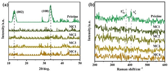 Figure 2 shows the XRD patterns and Raman spectra of MOST/C nano-multilayer films before and after irradiation. It can be seen from the figure that there are two diffraction peaks (002) and (100) in the film before irradiation, and the peak intensity of the latter is higher than that of the former, indicating that the internal grains of the film mainly grow in the orientation perpendicular to the substrate (100) []. In Figure 2b, the film before irradiation has two typical vibration peaks of MoS2 film, E12g and A1g, near 400 cm−1 []. In addition, since the top layer is the MOST layer and the laser power needs to be controlled to avoid burning the film, the signal of layer C cannot be detected in the Raman characterization. After irradiation, the XRD pattern and Raman spectrum peaks of the film disappear, indicating that the internal grains of the film were destroyed and transformed into amorphous states. The peak of irradiated film MC1 (irradiation dose is 1 × 1014 ions/cm2) disappeared, indicating that the film had poor anti-irradiation performance. It can be found from here that the structure had little influence on the stability of the internal crystal structure of MoS2 composite film under an irradiation environment.