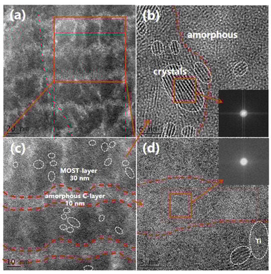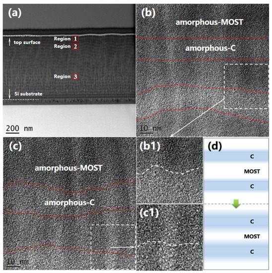 Figure 4 shows the cross-section image of the irradiated sample MC4. Region 3 is not affected by irradiation. Regions 1 and 2 correspond to the near-surface region and the damage peak region of the irradiation damage area, respectively []. The Figure 4b,c is locally enlarged images of regions 1 and 2, respectively. According to the enlarged images of different areas, the film shows a completely disordered state after irradiation, which is consistent with the previous XRD characterization results. The intergranular amorphous C layer and irregular interface do not give the film anti-irradiation ability, and the stability of the MoS2 crystal is still poor. In addition, through the comparison of the thickness of each layer in different areas, it is found that the deeper into the film, the more blurring of the interface between the MOST layer and the C layer, and the more serious the diffusion of the C layer to the MOST layer (C diffuses more easily than MoS2 under irradiation), as shown in Figure 4d.