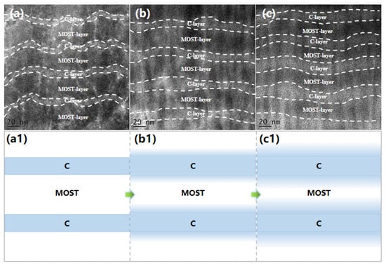 For more obvious observation, the areas under different injury degrees were compared. As shown in Figure 5, (a) is the cross-section image of the irradiation region; (b,b1) is the cross-section image of the area where the damage degree is about 2 displacement per atom (dpa); (c,c1) is the cross-section image of the area with a damage degree of about 5 dpa. By comparing images of areas with different damage degrees, it can be seen more directly that the diffusion phenomenon of layer C becomes more serious with the increase of irradiation damage degree. After the ions are injected into the film, energy dissipation occurs when they collide with the target atoms, and a collision cascade phenomenon occurs. The free volume of the atoms at the irregular amorphous interface is large, and the occurrence of a collision cascade is easy to make the atoms migrate and diffuse between the layers. In addition, the thermal effect produced by ion bombardment in the film further provides the kinetic energy of atomic motion, so the higher the damage degree (the more serious the bombardment), the more obvious the diffusion phenomenon.