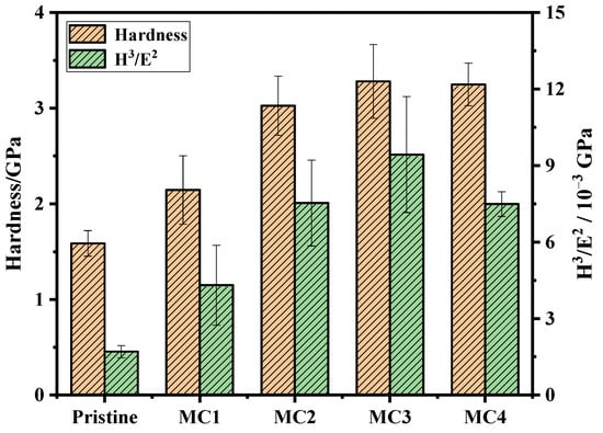 The change in the structure of MOST/C nano-multilayer films will inevitably lead to a change in their properties. The test of its anti-irradiation hardening found that its hardness increased with the increase of irradiation dose because the structure and internal energy of the film were changed by ion bombardment (Figure 6) [,]. However, when the irradiation dose increases from 6.6 × 1014 to 1.65 × 1015 ions/cm2, the hardness of the film has little change, indicating that the influence of ions on the internal structure of the film tends to be saturated, and the irradiation hardening parameters of the film fall within this range. The maximum hardness of the pristine film is 2.08 times (1.58~3.28 GPa), an increase of 107.5%. Due to the existence of an amorphous C layer, the hardness of the pristine film is low, which affects the maximum hardness after irradiation. However, the irradiation hardening degree of the film is within the acceptable value range of the film irradiated by MoS2 (the increase is less than 250%) [,].
