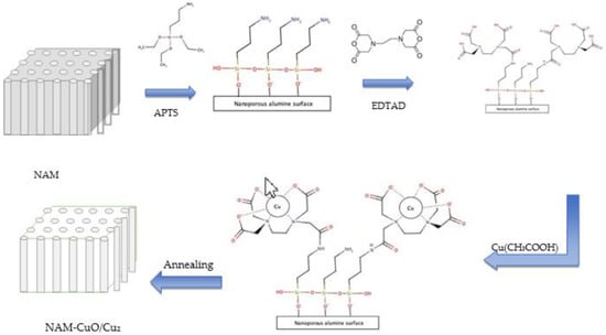 Schematic representation of every step of modification of hydroxylated nanoporous alumina membrane to produce NAM-CuO/Cu2O systems.