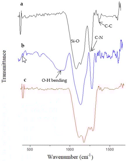 Figure 3 shows the normalized FT-IR spectra of the surfaces of the NAM-APTS, NAM-APTS-EDTAD, and NAM-CuO/Cu2O systems. The previous treatment of NAM with H2O2 allowed us to generate an enriched surface of activated –OH groups. Thus, a covalent bond between hydroxyl groups and silane derivatives is conveniently formed on the surface of porous alumina []. The presence of Si—O stretching was observed at approximately 1125 cm−1 []. Additionally, the signals at approximately 1300 and 1200 cm−1 could be ascribed to C—N stretching and C—C bending vibrations, respectively (Figure 3a).
