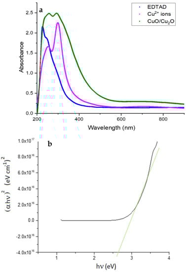 Among numerous cations that are suitable to be adsorbed by EDTA, copper derivates have attracted much attention because of their numerous applications and advantages. Specifically, copper oxides (CuO and Cu2O) are p-type semiconducting compound members of the family of copper compounds employed in diverse applications, such as batteries, biosensors, solar energy conversion, and photocatalysis. Interestingly, CuO and Cu2O nanoparticles exhibit a relatively narrow band gap (~1.2 and 2.0–2.2 eV, respectively), resulting in exploitable visible-light-active behavior that is very useful for energy conversion, photoconductive functionalities, and photocatalytic properties [,,,].