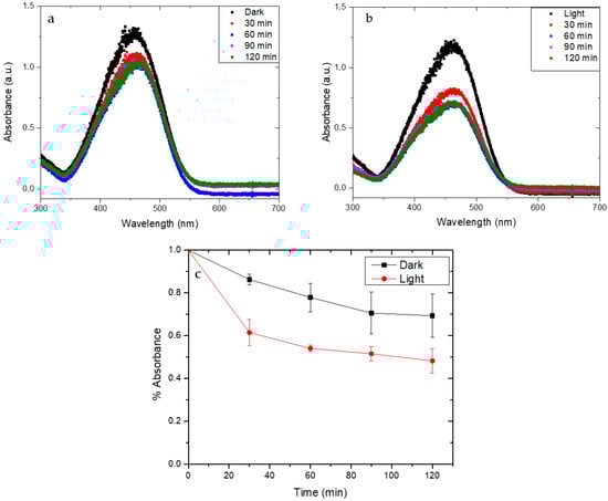 To confirm the photocatalytic properties of the NAM-Cu/Cu2O systems, degradation of MO was performed in the presence of NAM-CuO/Cu2O in aqueous medium for 2 h (Figure 7a,b). Approximately 25% and 50% MO was removed in the dark and under visible light irradiation, respectively. This reflects the predominant effect of the light irradiation on the process of degradation of the organic molecule of MO. Considering this, the proposed mechanism would address the adsorption of the MO onto the membrane surface and subsequent degradation.