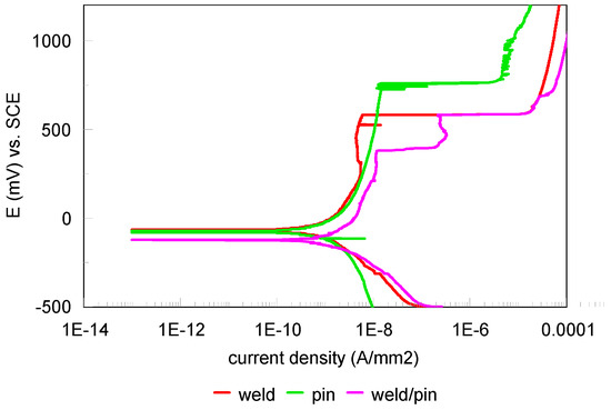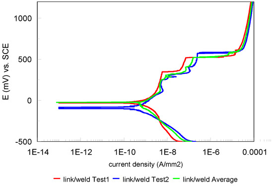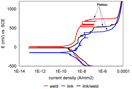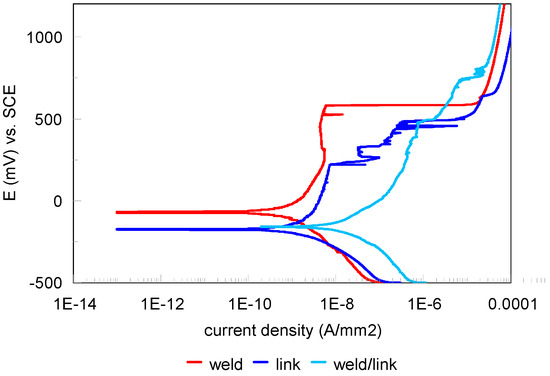 - plotting of the potentiodynamic polarization curves between −500 mV and +1200 mV.