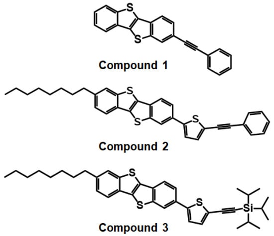 In this study, we have synthesized three BTBT derivatives, 2-(phenylethynyl)benzo[b]benzo[4,5]thieno[2,3-d]thiophene (Compound 1), 2-octyl-7-(5-(phenylethynyl)thiophen-2-yl)benzo[b]benzo[4,5]thieno[2,3-d]thiophene (Compound 2), and Triisopropyl((5-(7-octylbenzo[b]benzo[4,5]thieno[2,3-d]thiophen-2-yl)thiophen-2-yl)ethynyl)silane (Compound 3) (Figure 1). Physicochemical properties of the three synthesized compounds were investigated using thermogravimetric analysis (TGA), differential scanning calorimetry (DSC), UV–vis spectroscopy, and cyclic voltammetry (CV). Theoretical calculation was performed to determine HOMO/LUMO energy levels. Then, atomic force microscopy (AFM) and X-ray diffraction (XRD) were utilized for the investigation of surface morphology and the texture of the thin films. Finally, electrical performance of all compounds was investigated by fabricating and characterizing OFETs based on solution-sheared OSC films. Compound 1, with the BTBT core and phenyl group linked by the acetylenic bond, showed the highest hole mobility up to ~0.03 cm2/Vs and current on/off ratio of over 106 with decent long-term ambient stability.