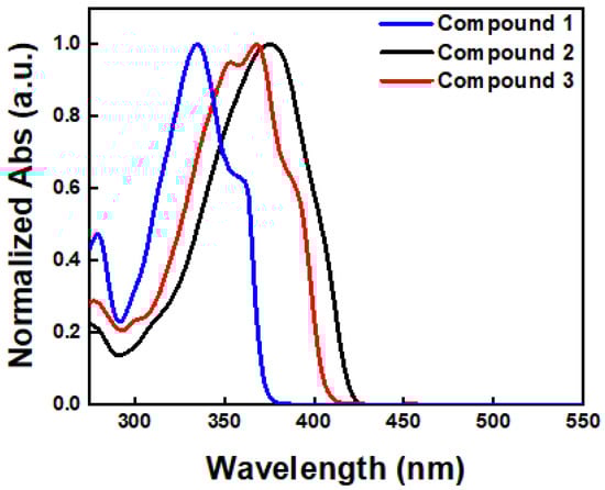 The optical properties of the developed compounds in diluted chloroform solution were measured using UV–Vis spectroscopy (Figure 2). The maximum absorption wavelengths for each compound were observed at 335, 375, and 368 nm, respectively. As shown in Figure 2, Compounds 2 and 3 exhibited red-shifted maximum absorption peaks compared to Compound 1, owing to the extended conjugation length attributed to the presence of thiophene rings (vide infra). Compound 2 particularly showed a slightly red-shifted maximum absorption peak compared to Compound 3 due to the existence of the phenyl group. Furthermore, the band gap energy (Egap) estimated from the onset wavelengths of each compound were 3.34, 2.96, and 3.06 eV, respectively (Table 1).