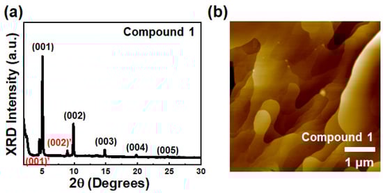 (a) XRD graph and (b) AFM topographic image of solution-sheared film of Compound 1.