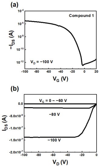 (a) Transfer and (b) output characteristics of the OFETs based on Compound 1.