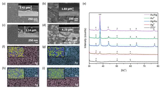 The results of the SEM analysis of the (a) Ag, (b) Au, (c) Ag/Au, and (d) Au/Ag thin films. (e) The results of the XRD analysis of the thin films. The results of the EDX analysis of the (f) Ag, (g) Au, (h) Ag/Au, and (i) Au/Ag thin films (inset: composition of all parts of the film). * is ITO, ° is Ag, and x is Au.