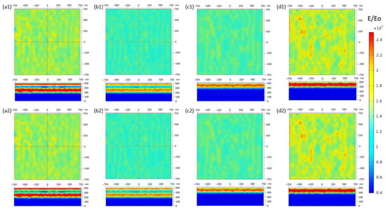 The top view and side view of the electric field distribution simulation on the (a) Ag, (b) Ag/Au, (c) Au, and (d) Au/Ag electrodes using the (1) normal and (2) hypoalbumin mediums.