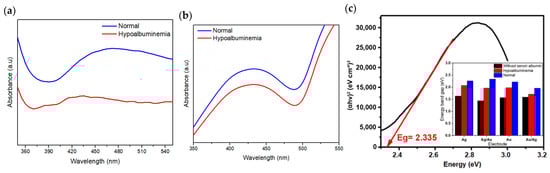 An increase in absorbance was exhibited, which indicates an increase in the absorption of electromagnetic wave energy by the electrons of the component materials; as a result, the electrons experience transition in their molecular orbitals [32]. The resulting energy from the wavelength of the absorbed photon can be calculated using the band gap energy value. Figure 3c shows the calculation of the bandgap energy values for Ag/Au thin films on serum albumin with normal concentrations, while Figure 3c insets the bandgap energy values for all types of electrodes with variations in serum albumin concentrations calculated using the same method. The Ag, Ag/Au, Au, and Au/Ag thin layer electrodes on ITO glass substrates had values of 1.636, 1.445, 1.573, and 1.598 eV, respectively. The value of the band gap energy for each type of electrode has a value that is not much different because the band gap energy of pure Ag and Au also has almost the same value [33]. This indicates that all the formed thin films can be classified as narrow band gap semiconductors. The addition of serum albumin on top of the thin films caused an increase in the band gap energy of the thin films. The increase in band gap energy may be due to the optical scattering effect and electronic absorption that occurred on the thin-film serum albumin system [34]. The largest increase in band gap energy values along with the addition of serum albumin concentration was found in the Ag/Au thin layer. So, Ag/Au is the best type of thin layer arrangement for optically monitoring serum albumin concentrations because Au bonds with biomolecules can cause high optical scattering effects and electronic absorption as well as large signal amplification due to the high conductivity of Ag.