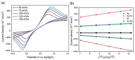 (a) The result of the CV test using varying scan rates on the Ag/Au thin film; (b) oxidation peak (represented in squares) and reduction peak (represented in circles) of the Ag, Ag/Au, Au, and Au/Ag thin films.