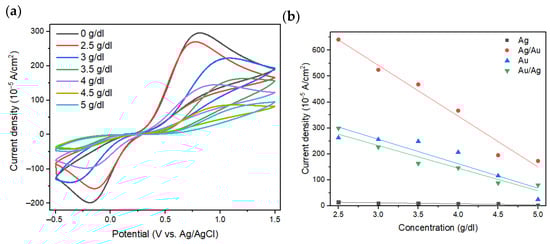 (a) The results of the CV tests with varying BSA concentrations on the Au/Ag thin film. (b) oxidation peaks of the Ag, Ag/Au, Au, and Au/Ag thin film electrodes with varying BSA concentrations.