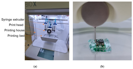 (a) Bioprinting process; (b) electronic device encapsulation with GelMa.