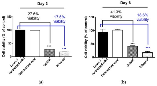 On the other hand, after 3 days in contact with the silicone-treated circuit, the RAW 264.7 cells showed a viability of only 17.5% compared with control untreated cells (Day 3: control untreated cells = 100 ± 0.1, n = 3; GelMA = 17.5 ± 0.3, n = 3), and this viability increased after 6 days in contact, but only to 18.6% (Day 6: control untreated cells = 94 ± 4.6, n = 3; GelMA = 18.6 ± 1.8, n = 3) (Figure 4).