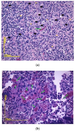 (a) GelMA section, ×20 magnification at 100 microns. Green arrows mark GelMA-biomaterial surrounded by histiocytes (black arrows) and lymphocytes (yellow arrows) random inflammatory cells; (b) GelMA section, ×40 magnification at 100 microns. Green arrows mark GelMA.