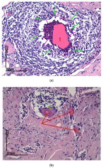 (a) HE staining, 20× magnification at 100 microns. Red arrows marks silicone. Green arrows mark macrophages. Purple arrows mark eosinophils; (b) HE stain 20× magnification at 100 microns. Green arrow marks a multinucleated foreign body giant cell trying to phagocytize the silicone (red arrow).