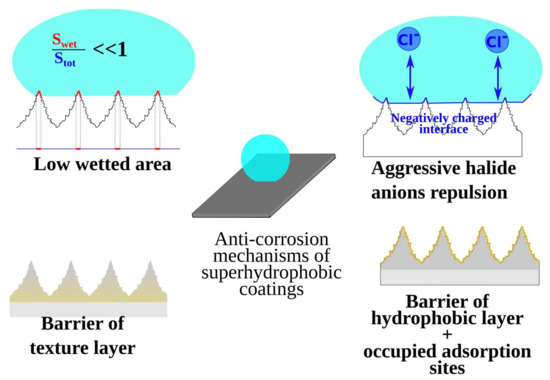 It was shown that aside from water repellence, many superhydrophobic coatings demonstrate anticorrosion [18], antibacterial [19], and anti-biofouling [20,21], as well as anti-icing [22] properties. Therefore, the area is experiencing a continued rapid growth in the number of new materials primarily focused on the design of polyfunctional coatings. Laboratory and industrial testing showed that well-prepared superhydrophobic coatings decrease corrosion rate by orders of magnitude by the modification of a thin surface layer without affecting bulk properties [23,24,25]. However, even coatings with very high contact angles and low roll-off angles may fail to demonstrate durable corrosion resistance [26,27,28]. Thorough analysis of the mechanisms behind the corrosion resistance of superhydrophobic coatings had shown that such protective properties cannot be explained only by the water repellence of such surfaces [29]. Indeed, literature data (see, for example, refs. [23,24,25,30,31]) report the superhydrophobic coatings on different metals for which the corrosion current shows to be 4–5 order of magnitude lower than that for the bare metal. At the same time, a decrease in the contact area due to capturing of air between an aqueous corrosive medium and the surface may only account for 2–2.5 orders. Thus, an explanation of the high protective properties requires the involvement of additional mechanisms (see Figure 1), discussed in recent studies [25,28,29,32,33]. One such mechanism is interface charging: for most hydrophobic materials, the isoelectric point is located deep inside the acid region of pH (around pH = 2–4) [34,35]. In other words, in neutral solutions, the interface between the aqueous medium and the superhydrophobic coating is negatively charged, causing a depletion of corrosively active anions, which is especially important when the coating is in contact with highly corrosive halide solutions. Additionally, molecules of hydrophobic agent compete with aggressive ions for adsorption sites, thus hindering the initiation of the corrosive reaction. Finally, often both the textured layer with multiscale features and the layer of hydrophobic agent act as barriers for charge transfer. That way, superhydrophobic coatings in which all these mechanisms are manifested demonstrate an extremely low corrosion rate.