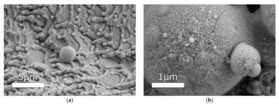 In contrast, cauliflower ablation texture obtained by 800 nm laser with 120 fs pulse duration hydrophobized by perfluorooctylsilane (FOTS) demonstrated inexplicably high corrosion current values [93]. Despite the well-developed morphology (Figure 5), additional pre-treatment in piranha solution in order to remove contamination and expose the hydroxyl groups on the surface, and a proper procedure of hydrophobization and cross-linking, the coating demonstrated high corrosion current of 5.9 × 10−5 vs. 5.8 × 10−6 A/cm2 for untreated surface. Authors of the paper claim high corrosion durability based on stability of open circuit potential over long-term contact with NaCl solution; however, given the high corrosion current, it instead indicates reaching a steady state of intensive corrosion reaction. Most probably, this high corrosion rate is a result of incomplete drying of the samples in nitrogen flow after washing. In accordance with Kelvin equation, the equilibrium vapor pressure above concave interface, in particular above menisci in nano-pores of the highly developed surface, is much lower than that above flat surface. Therefore, without additional heating, the complete drying of capillary condensed water requires a very long time. If, as we believe, the surface had not been completely dried prior to the hydrophobization stage, it was not hydrophobized appropriately.