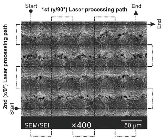 SEM micrographs of laser-textured surfaces with direction of laser passes. Adapted/redrawn with permission from [81], Elsevier, 2017.