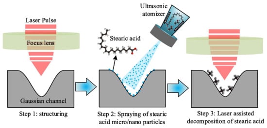 A scheme of coating fabrication via laser texturing and laser-assisted decomposition of stearic acid. Reprinted with permission from [87], Elsevier, 2022.