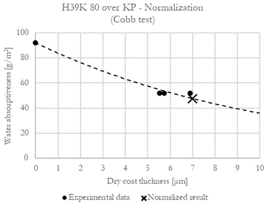 The normalization is due to kaolin, whose density (almost 2.5 times higher than one of the commercial dispersion coatings) strongly influences the coating thickness at an equal dry coat grammage. If neat polymeric dispersion coatings were exclusively used, normalization on the dry coat grammage would have worked as well.