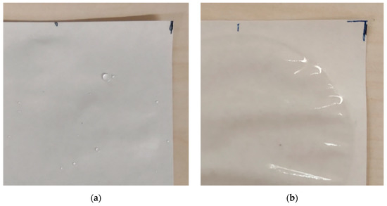 Different coating wettability. (a) SA-B over KB: water droplets are clearly visible; (b) H39K 80 over KB: water is evenly spread across the tested surface.