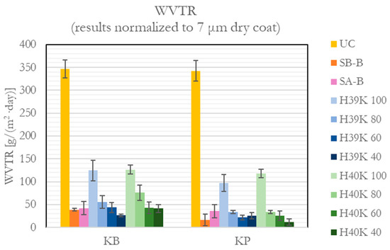 The moisture barrier property showed to strongly improve compared with uncoated paper substrates, as represented in Figure 6. From almost 350 g/(m2∙day) WVTR, the coatings reached values strictly lower than half of UC ones. Moreover, excluding H39K 100 and H40K 100—which still showed good performance—the coatings reduced the WVTR by more than 85%, compared with UC.