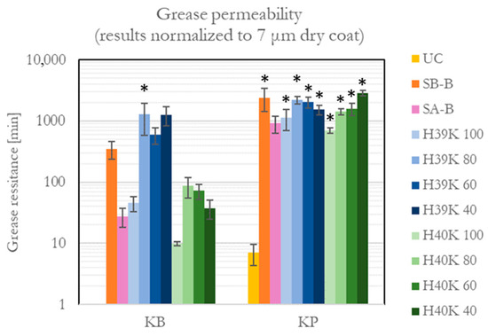 Grease permeability was successfully improved compared with UC samples, where KB has a resistance of a few seconds and KP of up to 7 min. The results are reported in Figure 7. It is possible to observe differences as high as two orders of magnitude, depending on whether the KB or KP substrate is considered.